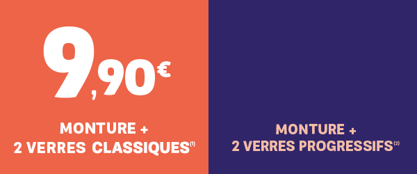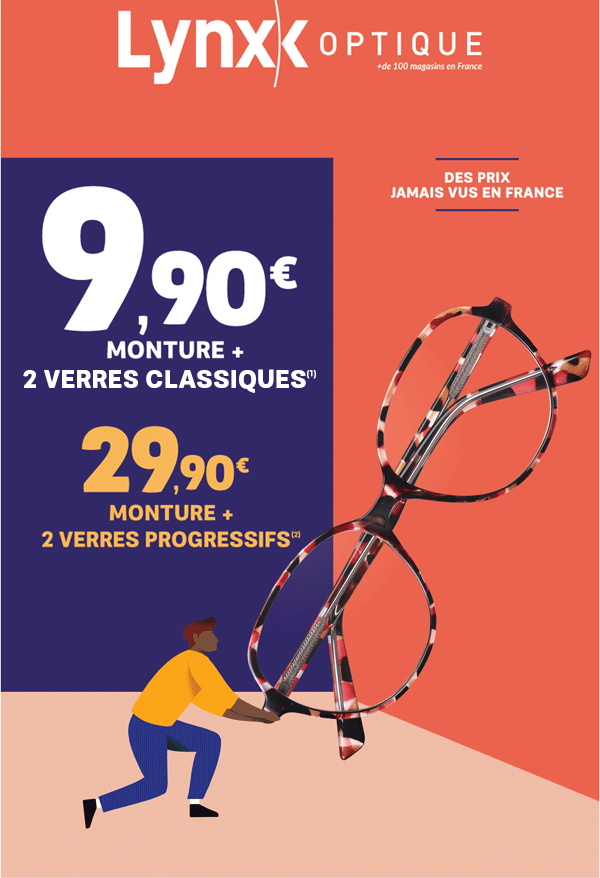 (2) Forfait à 29,90e* : Valable dans ce magasin Lynx. Ce forfait comprend : une monture à choisir parmi notre sélection de marque Alternance indiquée en magasin + 2 verres progressifs de la gamme Make It Easy 1,5 corrections sphère + cyl max -10.00/+6.00 ; cylindre max 4 ; addition de 0.75 à 3.50 dioptries. Offre non valable sur un équipement équipé, en tout ou partie (monture et/ou verres), d'un produit bénéficiant d'un tarif spécial au titre du forfait 100% santé/Classe A. Non cumulable avec tout autre forfait, promotion, tarif spécifique ou avantage en cours. *Prix de vente TTC maximum conseillé en magasin.