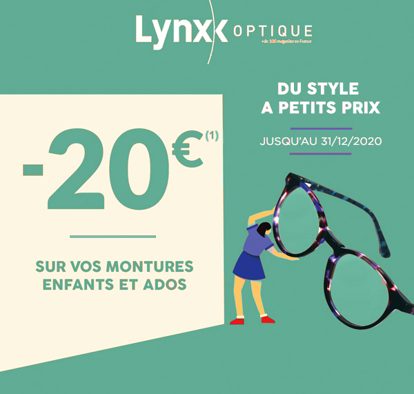 (1) Offre valable jusqu'au 31/12/2020 dans ce magasin Lynx Optique. Pour l'achat d'un équipement optique enfant/adolescent complet (monture + 2 verres correcteurs), bénéficiez de 20€ de réduction immédiate à valoir sur le prix de vente TTC affiché en magasin de la monture de votre choix. Remise effectuée en caisse. Offre non valable sur un équipement équipé, en tout ou partie (monture et/ou verres), d'un produit bénéficiant d'un tarif spécial au titre du forfait 100% santé/Classe A. Non cumulable avec l'opération veepee.fr, avec tout autre forfait, promotion, tarif spécifique ou avantage en cours, à l'exception de l'offre 2ème paire optique ou solaire à partir de 1€ de plus. Les lunettes correctrices sont des dispositifs médicaux qui constituent des produits de santé règlementés portant à ce titre le marquage CE.