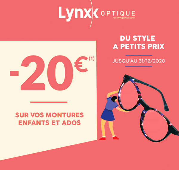 (1) Offre valable jusqu'au 08/20 dans ce magasin Lynx Optique. Pour l'achat d'un équipement optique enfant/adolescent complet (monture + 2 verres correcteurs), bénéficiez de 20€ de réduction immédiate à valoir sur le prix de vente TTC affiché en magasin de la monture de votre choix. Remise effectuée en caisse. Offre non valable sur un équipement équipé, en tout ou partie (monture et/ou verres), d'un produit bénéficiant d'un tarif spécial au titre du forfait 100% santé/Classe A. Non cumulable avec l'opération veepee.fr, avec tout autre forfait, promotion, tarif spécifique ou avantage en cours, à l'exception de l'offre 2ème paire optique ou solaire à partir de 1€ de plus. Les lunettes correctrices sont des dispositifs médicaux qui constituent des produits de santé règlementés portant à ce titre le marquage CE.